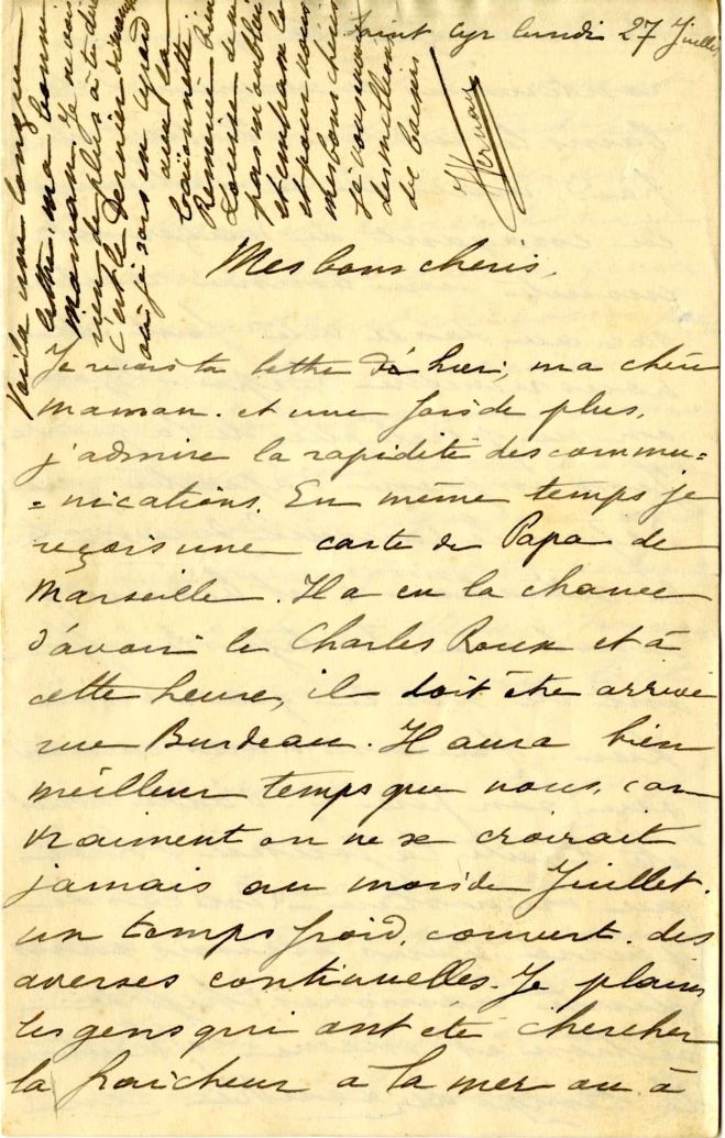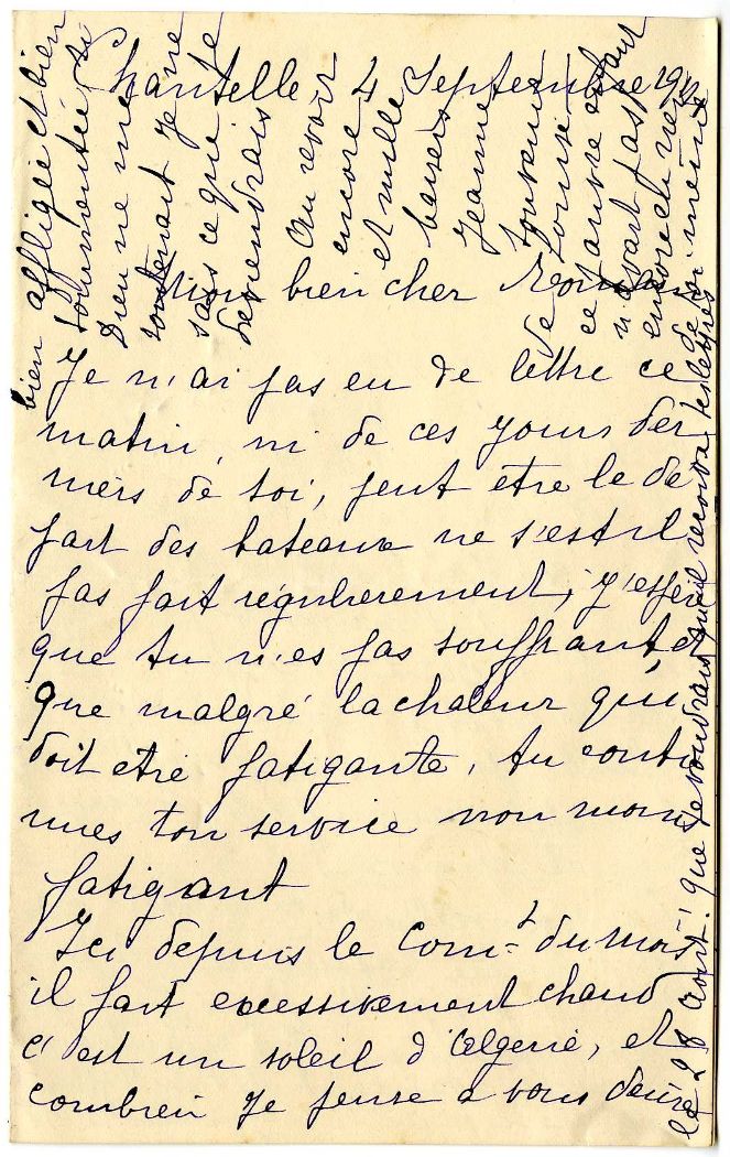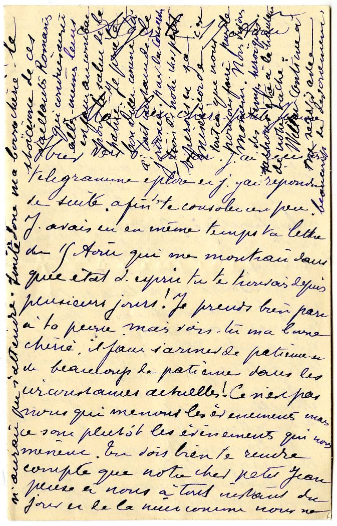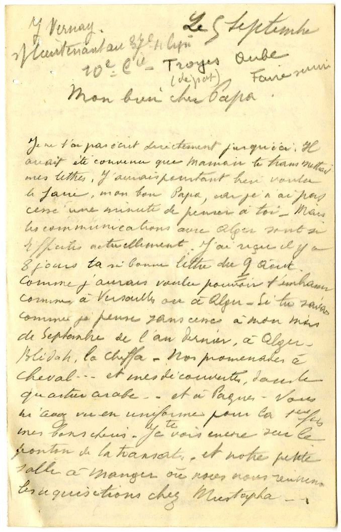 Pour rassurer sa mère, il lui décrit son quotidien (voir dessin de sa tranchée). Un ami de tranchées lui laisse également quelques gravures (voir gravures Jean Droit). Il exprime parfois une certaine nostalgie en évoquant ses souvenirs d’Alger où il vécut avec ses parents (voir lettre du 5 septembre 1914). Ses lettres témoignent également de sa piété (voir lettres du 31 août et du 13 septembre 1914). Dès qu’il le peut, Jean assiste à la messe. Deux mois après le début du conflit, il se voit confier le commandement de sa compagnie (voir lettre du 28 septembre 1914).
