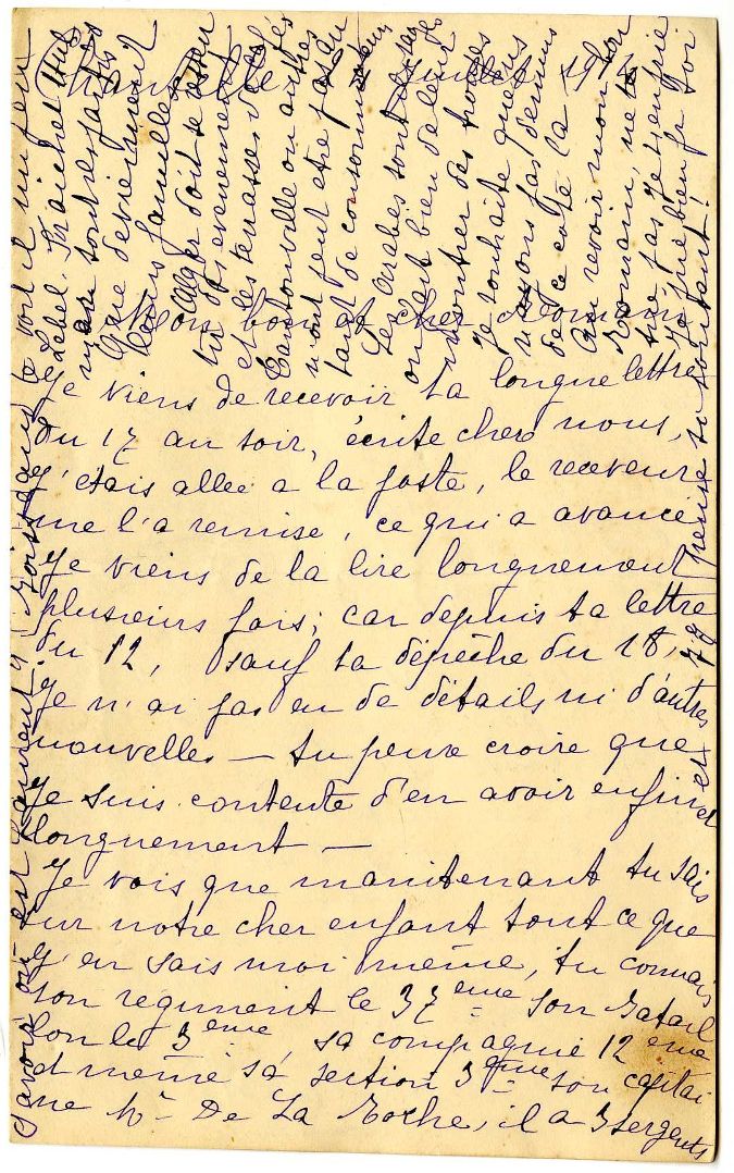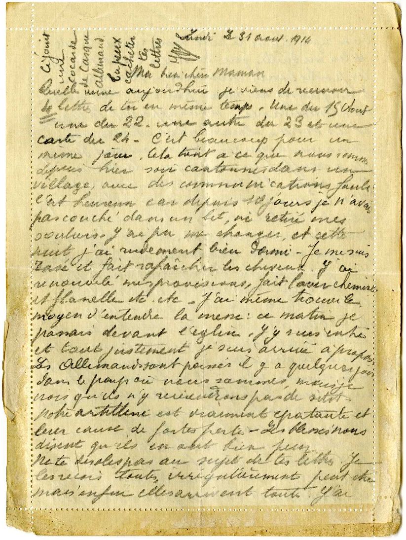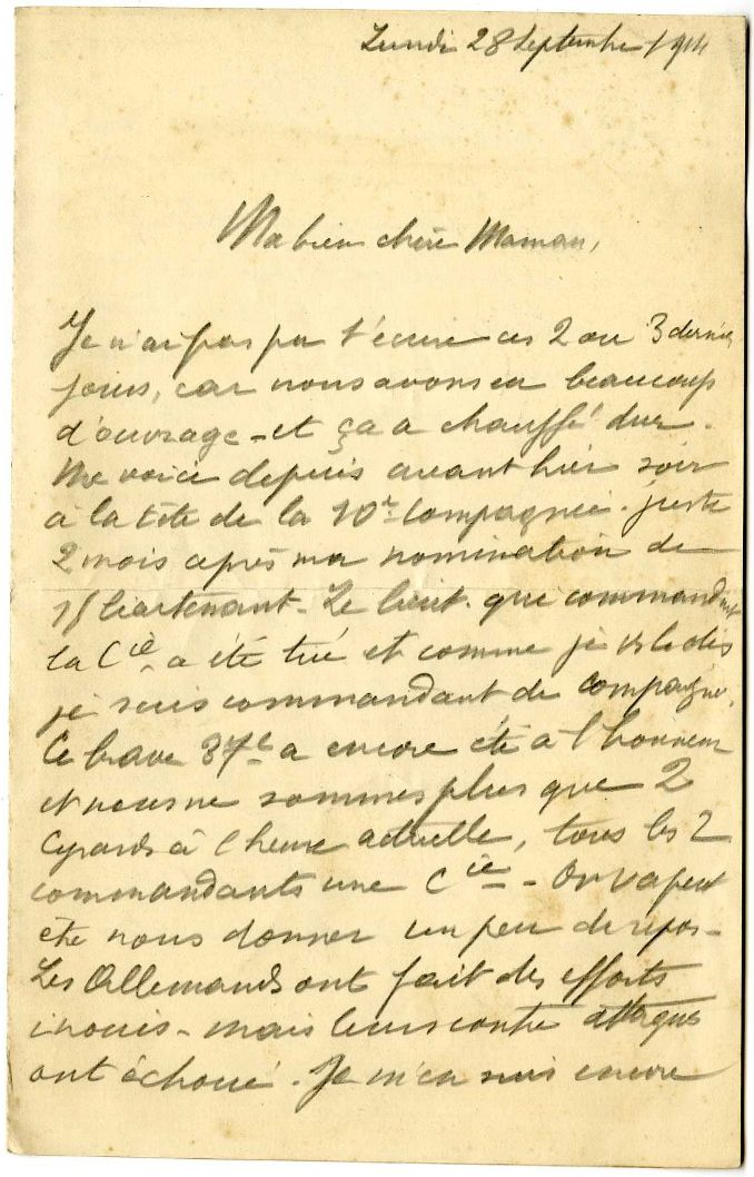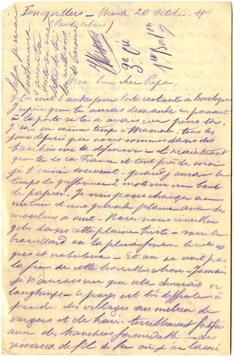 4 jours plus tard il insiste dans une lettre à son père : « Tu sais ce que je pense de ces attaques qui sont de véritables folies et n'ont comme résultat que des hécatombes d'hommes et rien de plus.(…). Je veux seulement dire qu'il est faux de répéter dans les journaux que les troupes sont pleines d'enthousiasme. Tout le monde en a assez et les soldats marchent parce qu'on les y oblige ». (voir lettres du 20 et 28 octobre 1914)