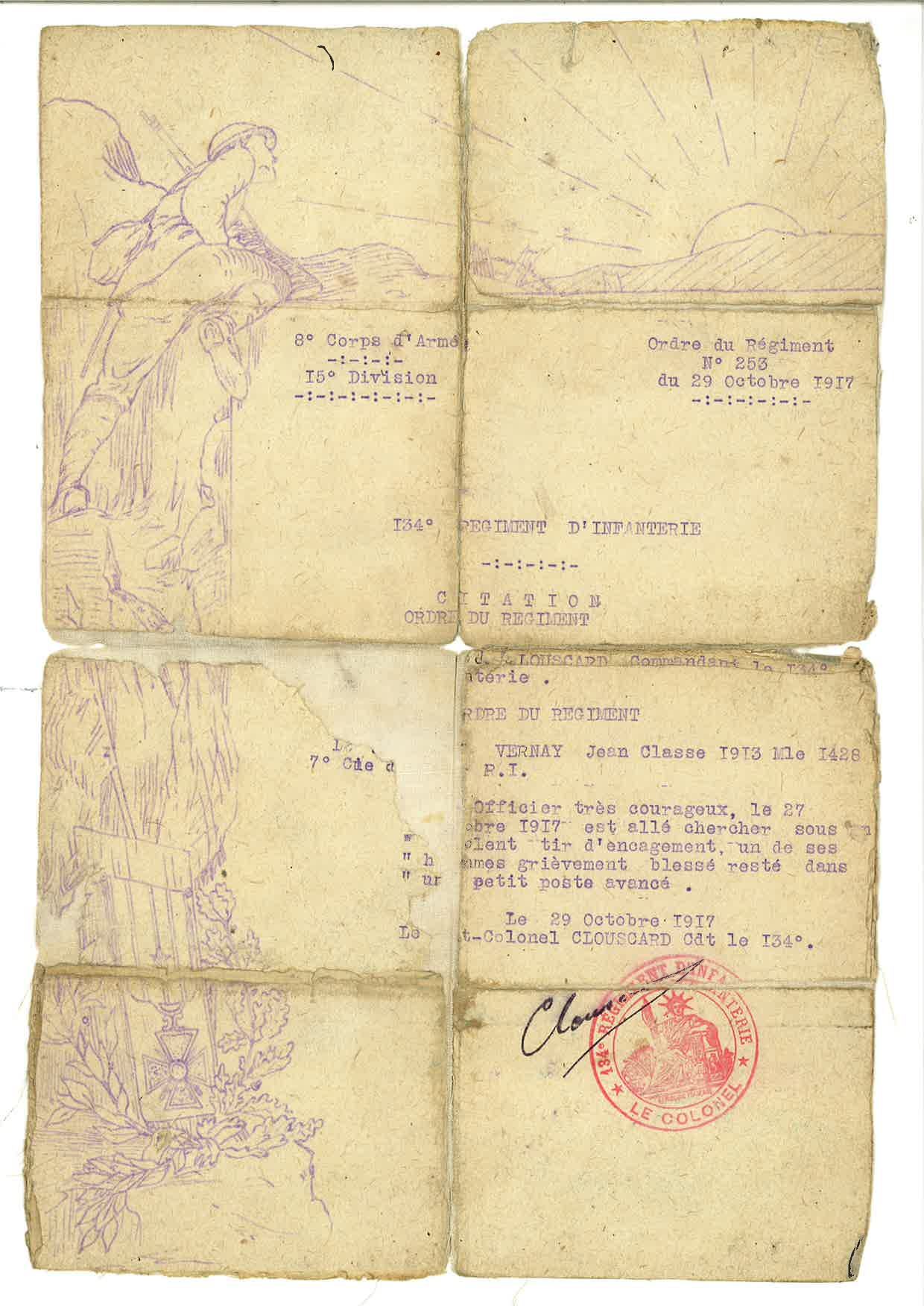 Il fut cité à l’ordre de son régiment le 29 octobre 1917 pour être « allé chercher sous un violent tir d’engagement un de ses hommes grièvement blessé » (voir citation).