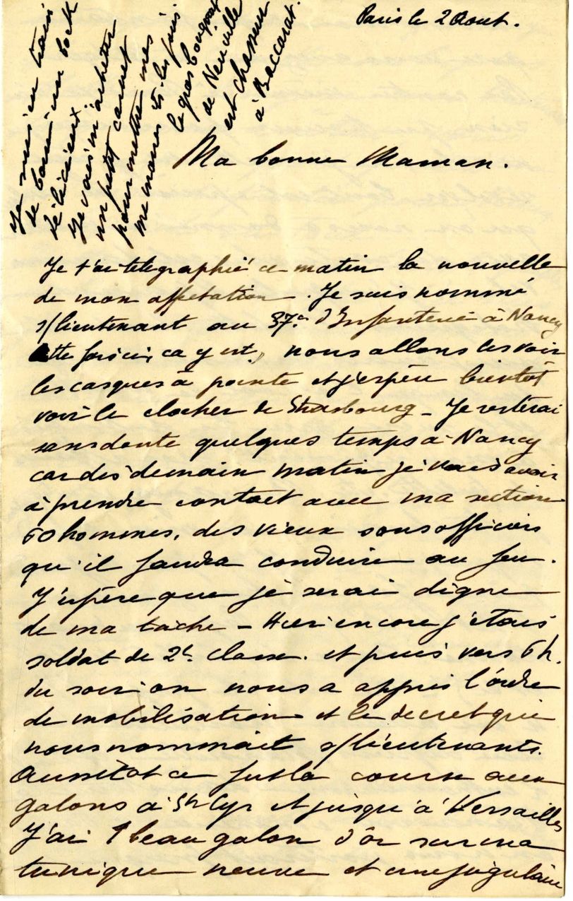 Au fil de sa correspondance avec ses parents du 27 juillet au 1er novembre1914 (voir correspondance de 1914), son ton évolue vis-à-vis de la guerre. Au début, même s’il tient déjà à se démarquer de « certains grands braillards et écervelés qui ne demandent que la guerre » (voir lettre du 27 juillet 1914). Il montre un enthousiasme naïf comme la majorité des jeunes mobilisés : « Cette fois ça y est, nous allons les voir les casques à pointe et j’espère bientôt voir le clocher de Strasbourg » (voir lettre du 2 août 1914).