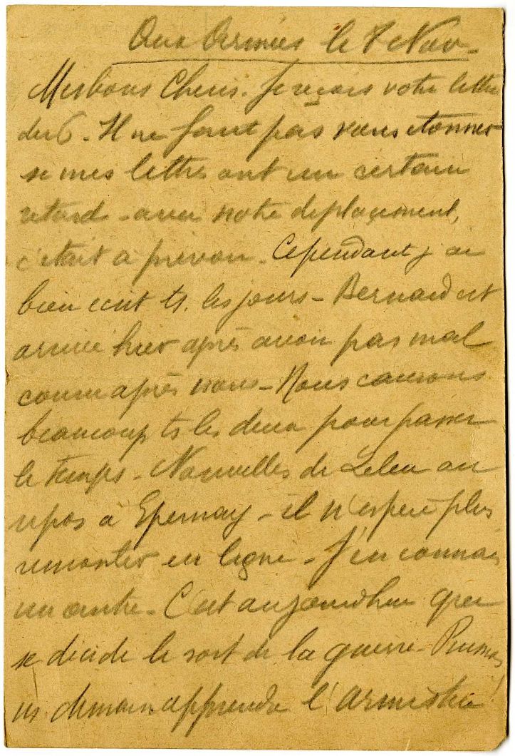 La fin de la guerre tant attendue encore la veille de l’armistice: « Je suis sûr que vous êtes dans l'attente de l'armistice. Nous l'attendons d'heure en heure par TSF », est évidemment saluée par Jean le 11 novembre 1918: « Ce matin les sergents des TSF ont envahi notre chambre avant le réveil avec force cris et hurlements. Nous avons vite compris ce que ça signifiait. Nous voici enfin au terme du cauchemar » (voir lettres des 8 au 11 novembre 1918)
