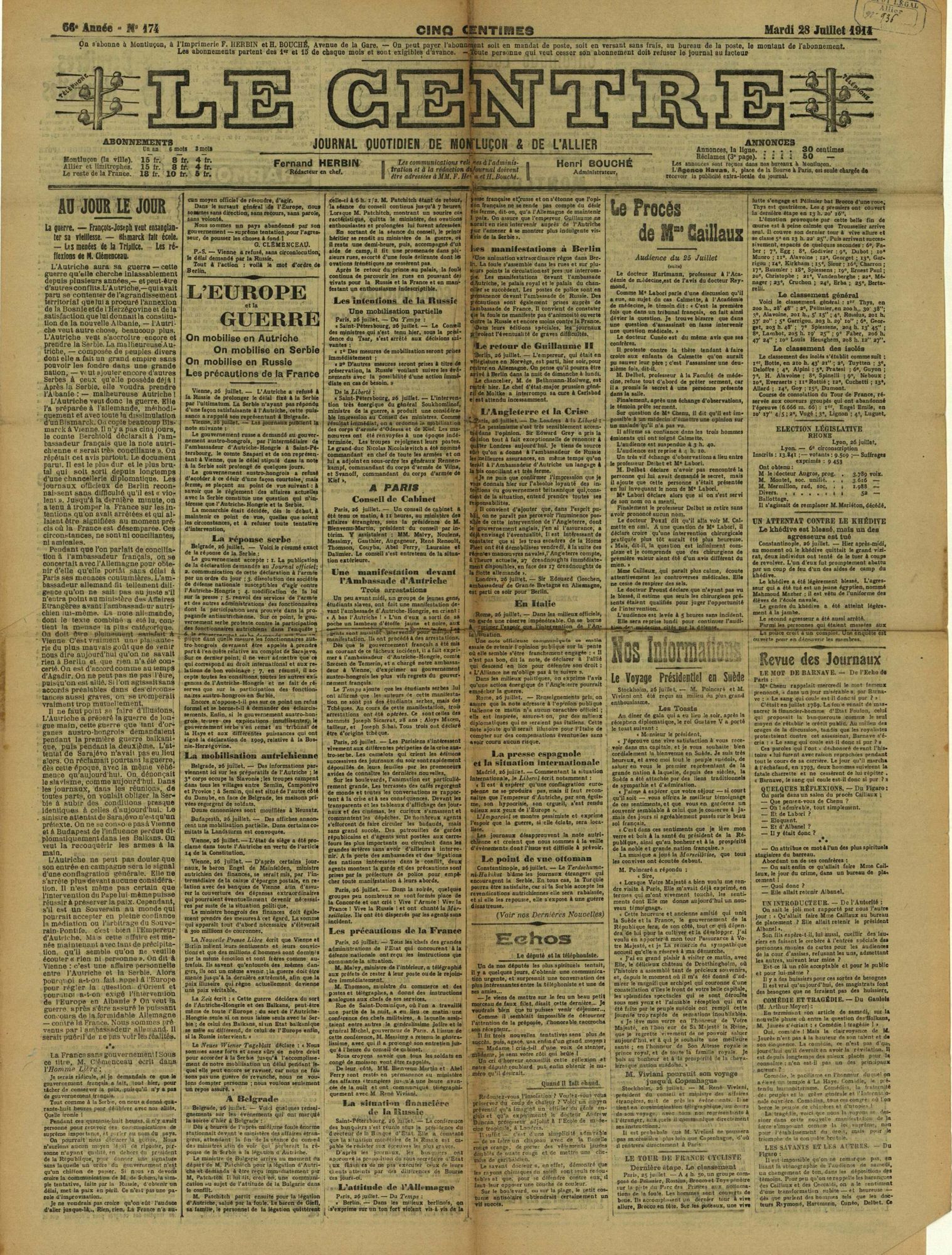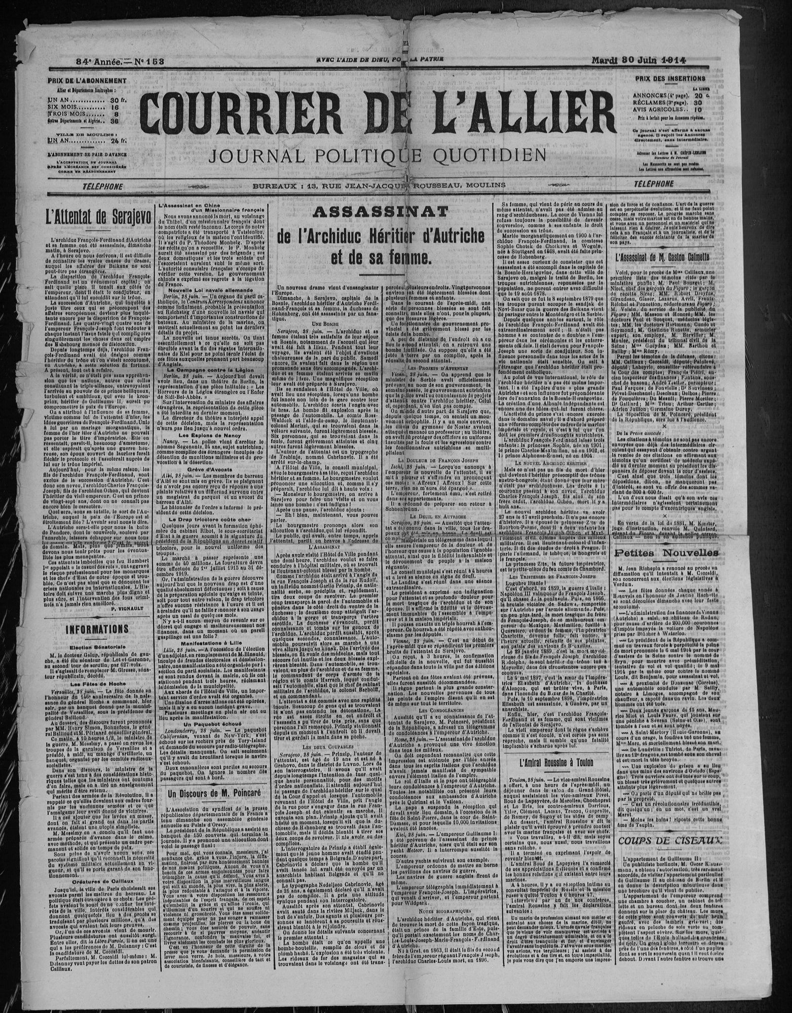Le 28 juin 1914, François Ferdinand de Habsbourg, héritier du trône d’Autriche-Hongrie est assassiné à Sarajevo, dans la province de Bosnie-Herzégovine récemment annexée par l’Autriche, au détriment de la Serbie. Les journaux locaux insistent sur les risques de déstabilisation de l’ordre européen mais aucun n’envisage explicitement l’éventualité d’un conflit. L’existence d’un double système d’alliance contribue à précipiter l’entrée en guerre des grandes puissances européennes en quelques jours.