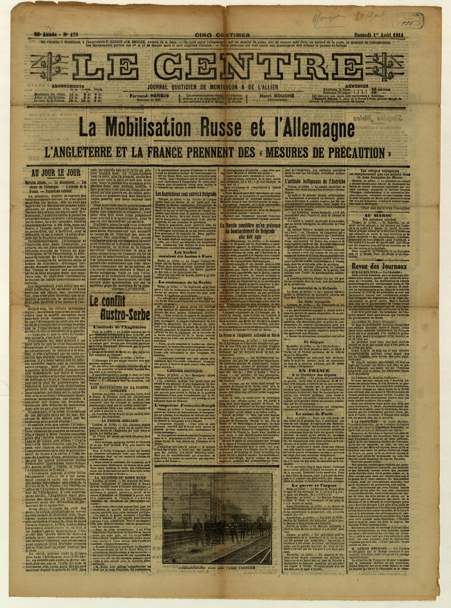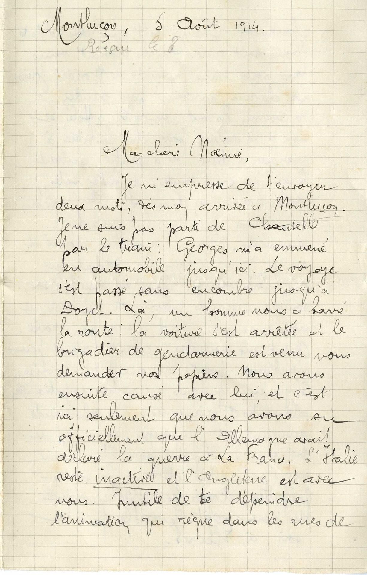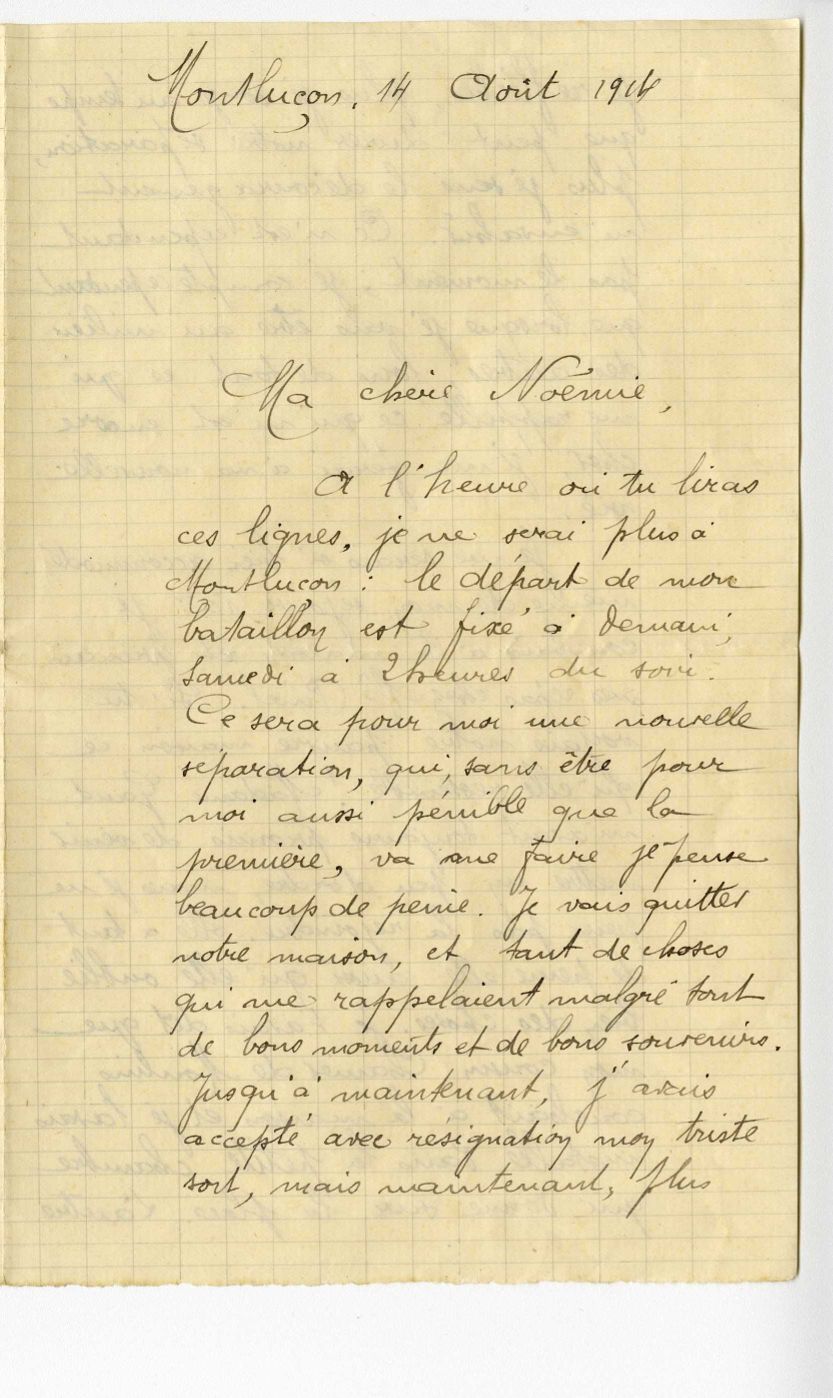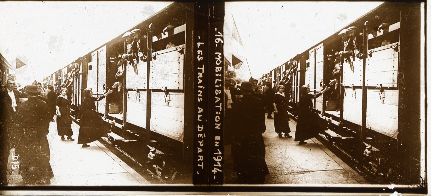 La population française, qui est informée de la mobilisation le 1er août 1914, accueille la nouvelle sans enthousiasme. La surprise et la consternation sont les sentiments les plus répandus dans les campagnes. Dans les jours qui suivent, c’est d’abord la résignation puis la résolution qui l’emportent : la guerre est acceptée sans opposition. L’idée d’un conflit court domine alors et les Français sont convaincus d’être victimes d’une agression allemande. Le départ des soldats pour le front donne parfois lieu à des manifestations patriotiques, comme à Montluçon.