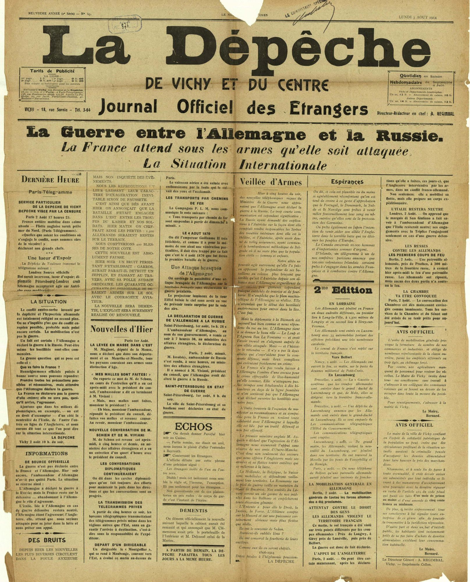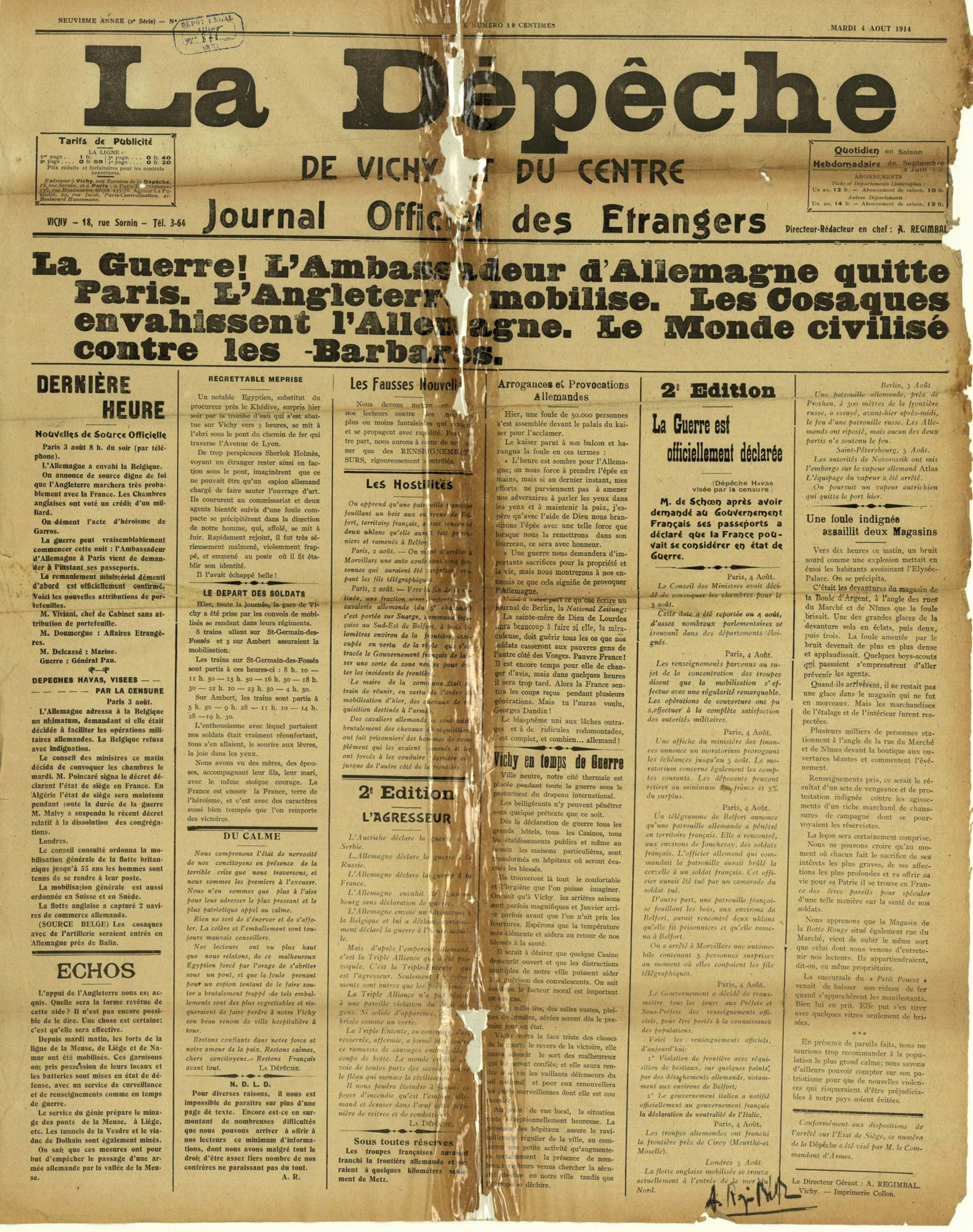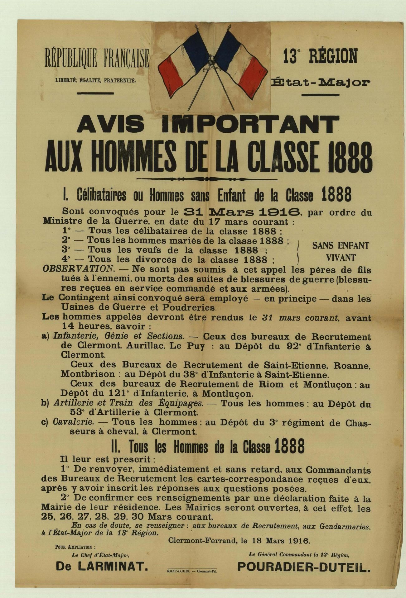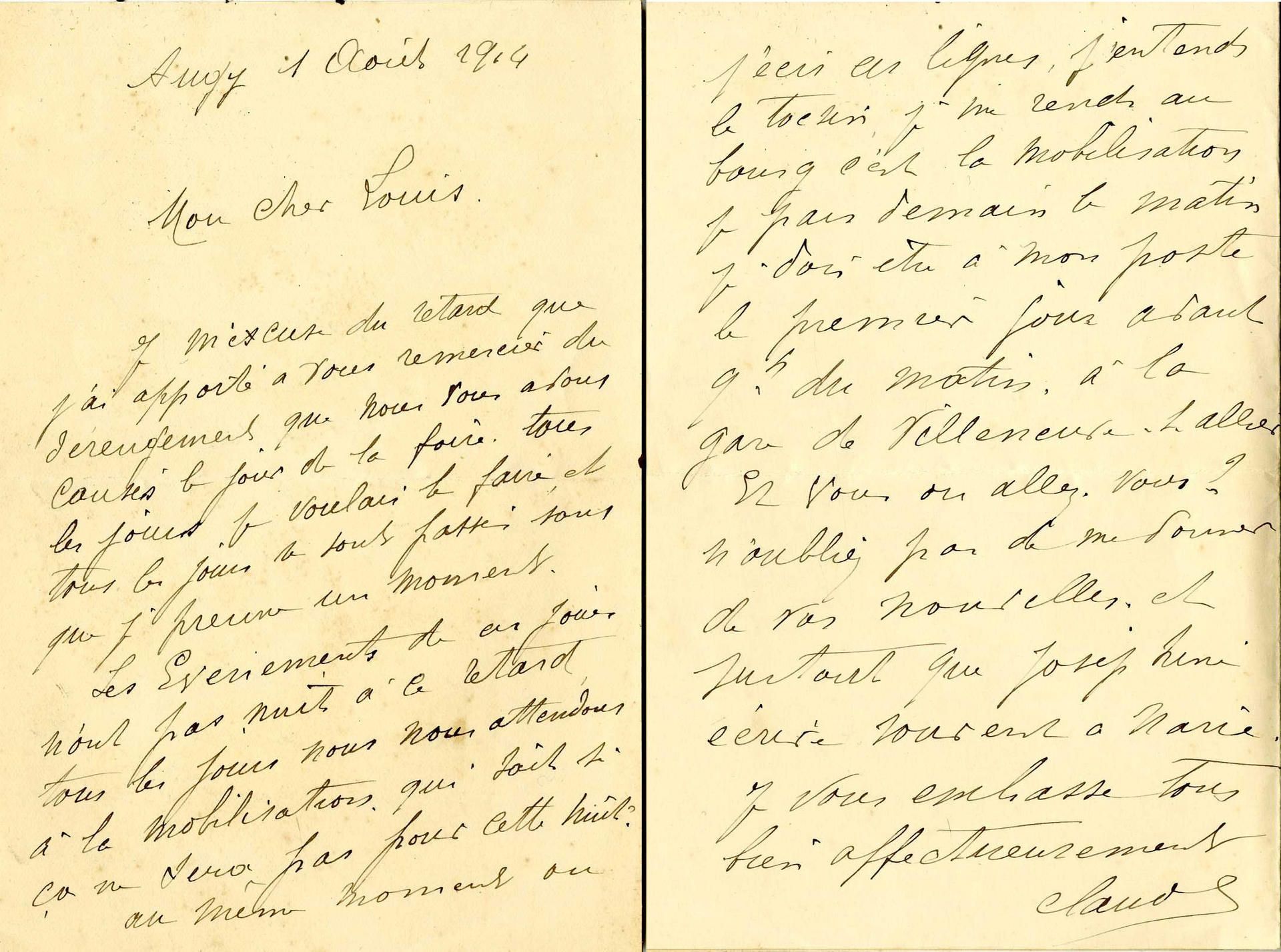 La population française, qui est informée de la mobilisation le 1er août 1914, accueille la nouvelle sans enthousiasme. La surprise et la consternation sont les sentiments les plus répandus dans les campagnes. Dans les jours qui suivent, c’est d’abord la résignation puis la résolution qui l’emportent : la guerre est acceptée sans opposition. L’idée d’un conflit court domine alors et les Français sont convaincus d’être victimes d’une agression allemande. Le départ des soldats pour le front donne parfois lieu à des manifestations patriotiques, comme à Montluçon.