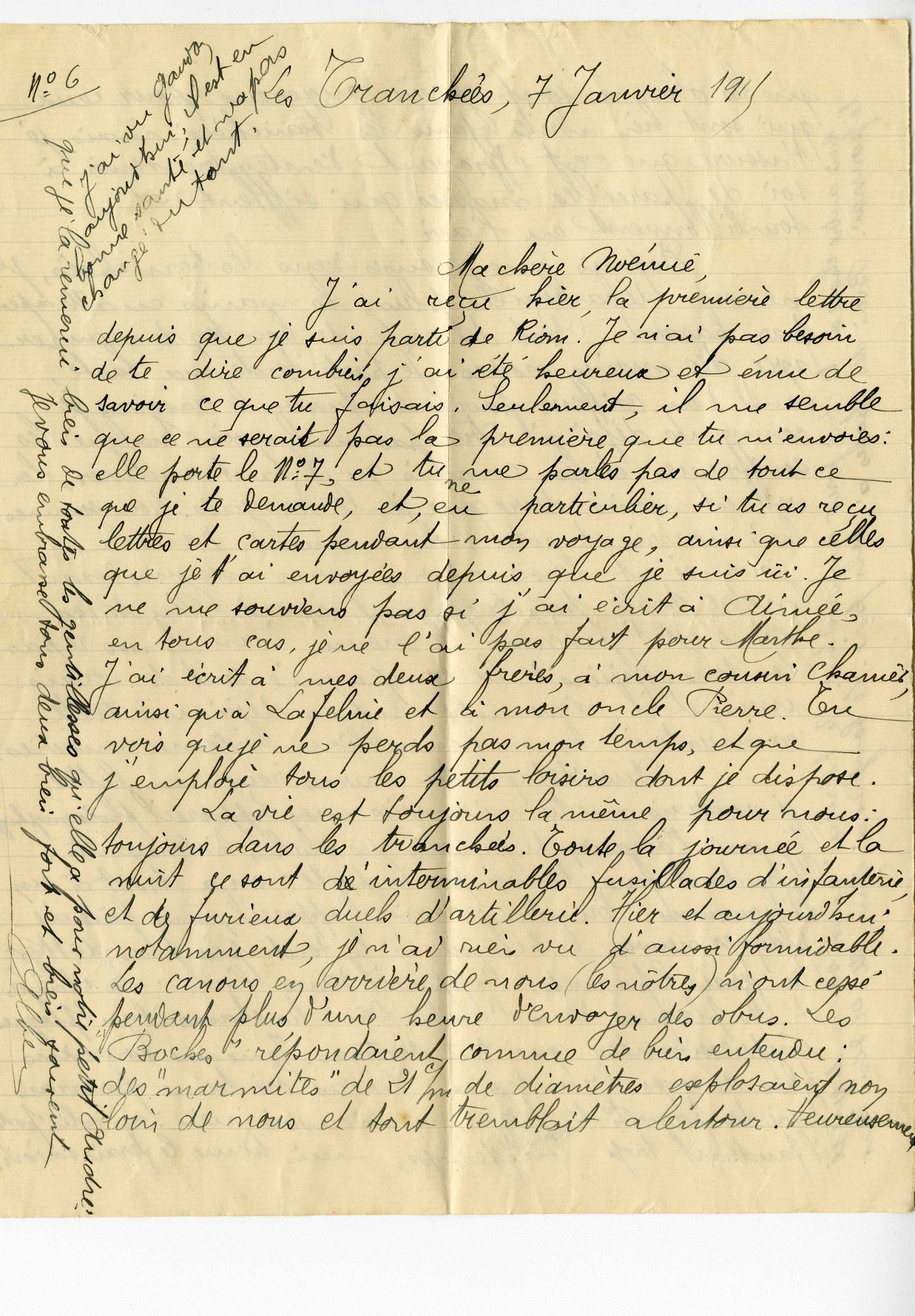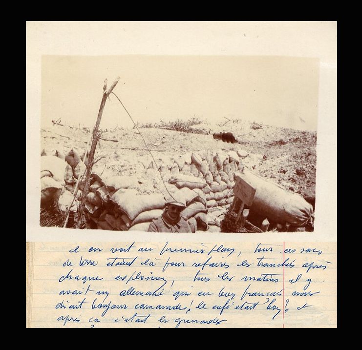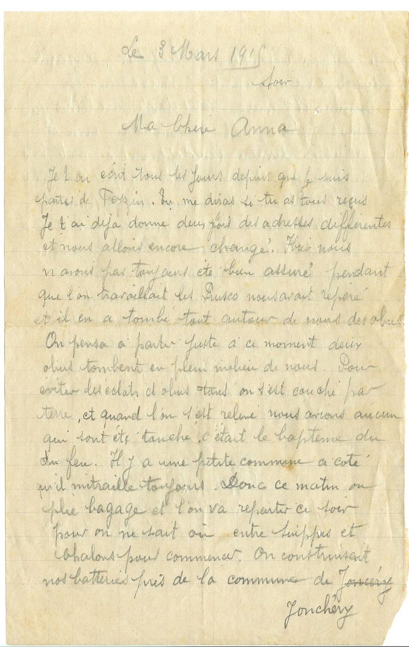 Dans sa lettre du 20 juillet 1915 adressée à son épouse, Albert Melin décrit le combat aérien auquel il vient d’assister : Aujourd’hui, j’ai assisté à une chose que je n’avais jamais vue encore depuis que je suis à la guerre : un combat d’aéroplanes dans les airs. Le français et le boches, armés chacun d’une mitrailleuse se sont tirés des coups et se sont poursuivis pendant longtemps. Finalement le boche a été touché sérieusement et il est retombé tout en flammes après avoir eu le temps de se diriger derrière ses lignes. Quant à notre aviateur, il avait reçu une balle au bras qui l’a obligé à atterrir non loin de nous ; la blessure n’est pas grave ; dans la soirée un autre aviateur est venu chercher son appareil et s’est envolé jusqu’au parc d’aviation.