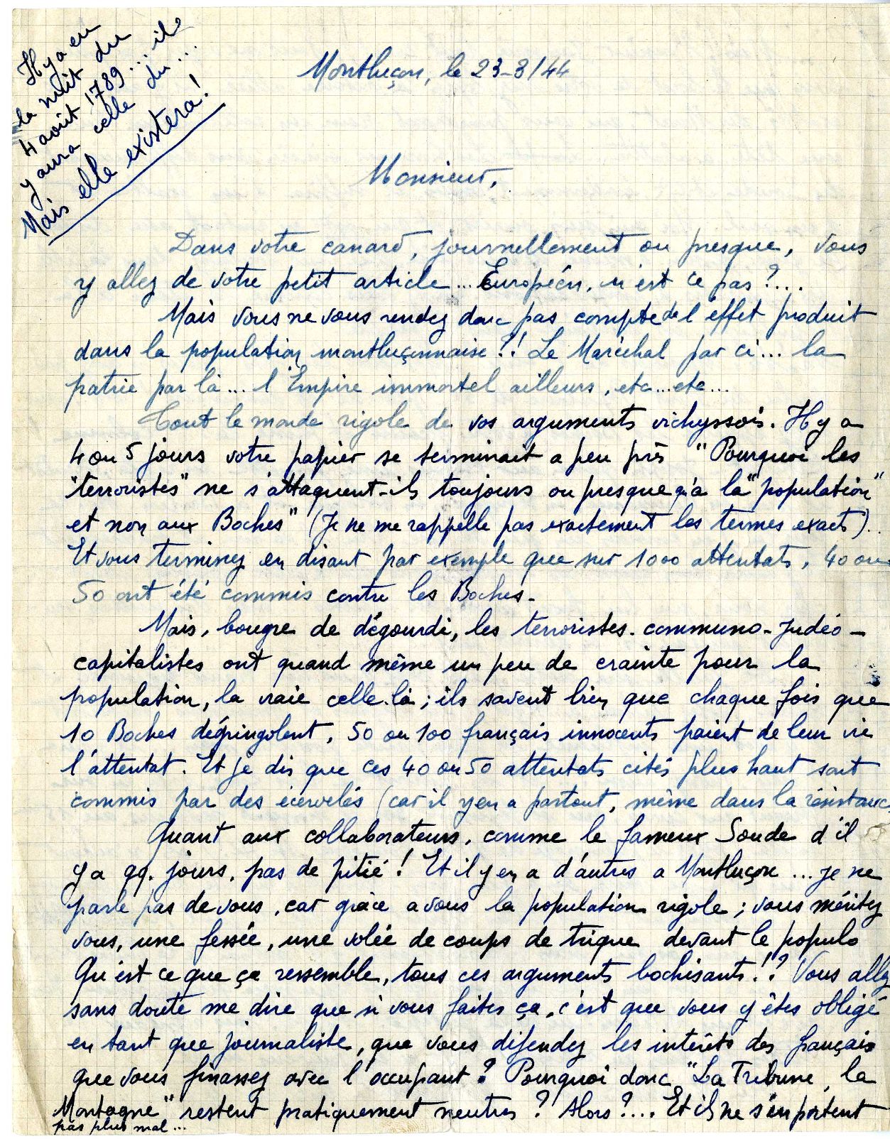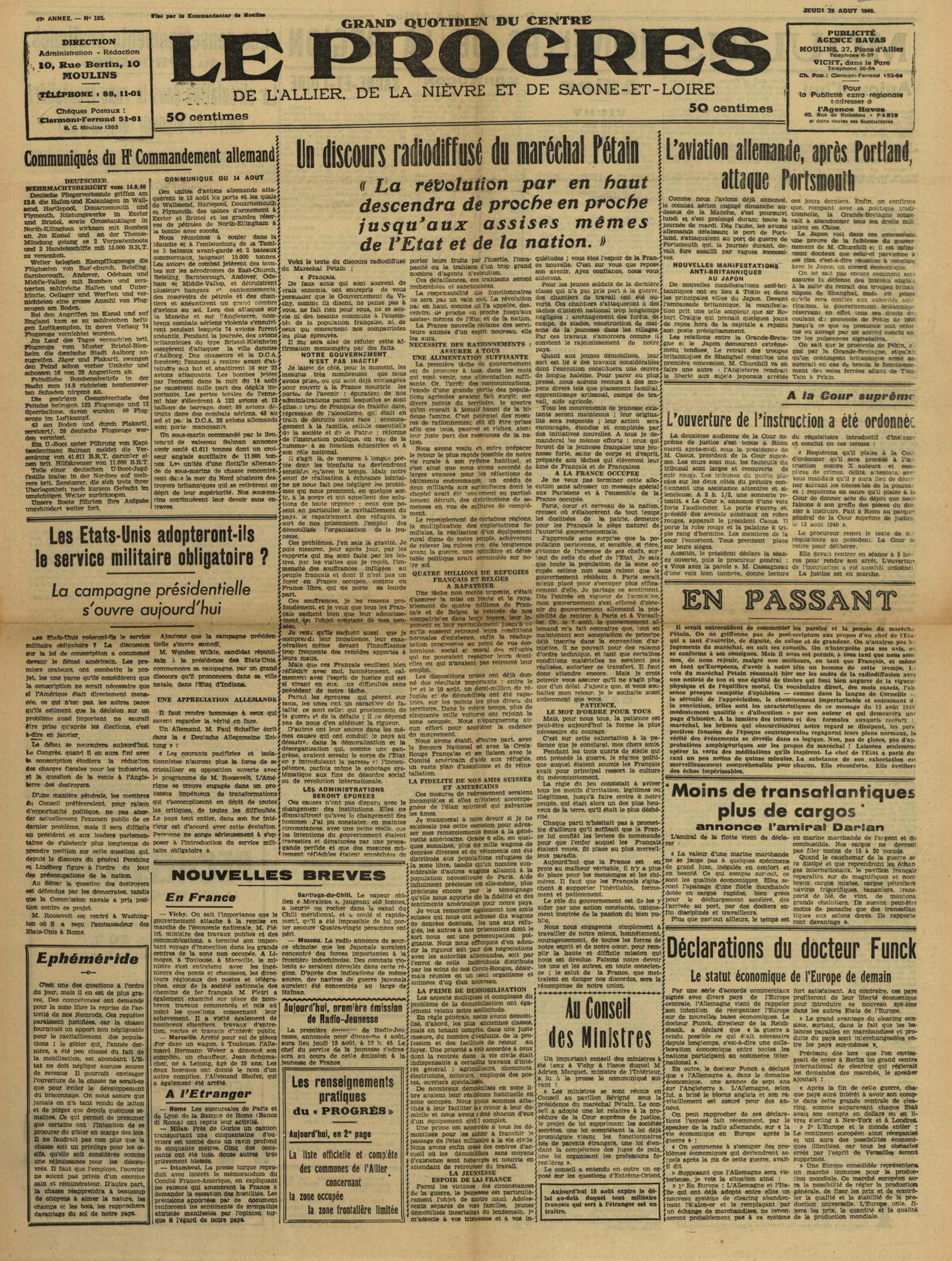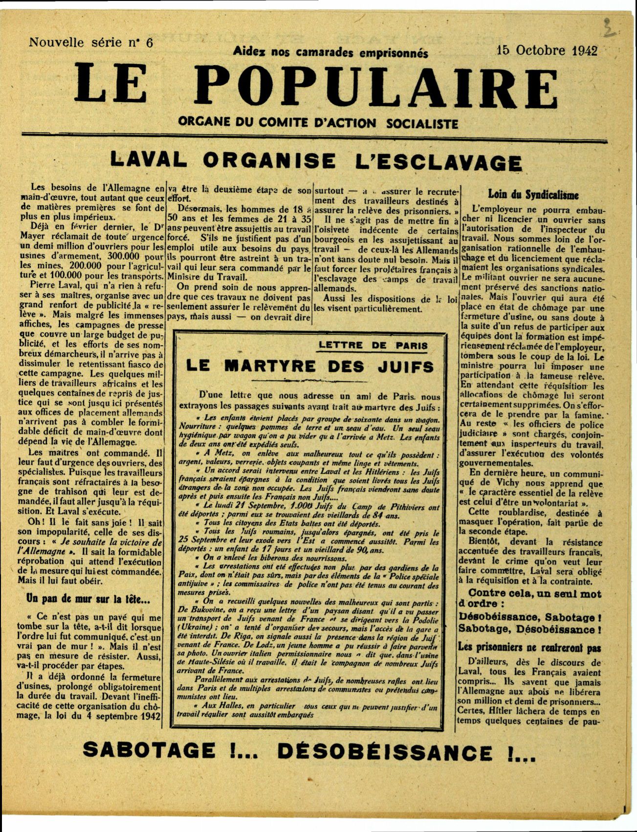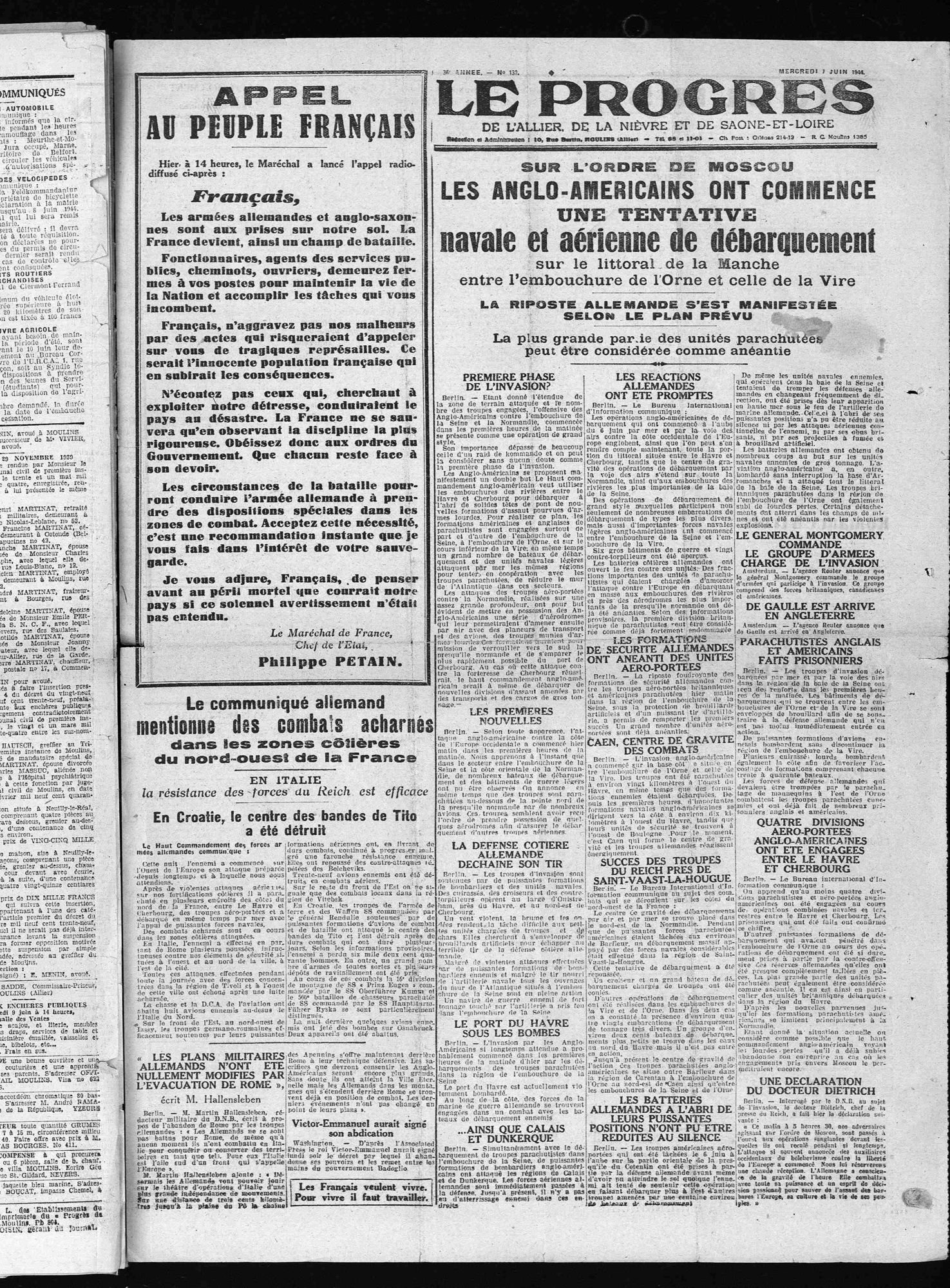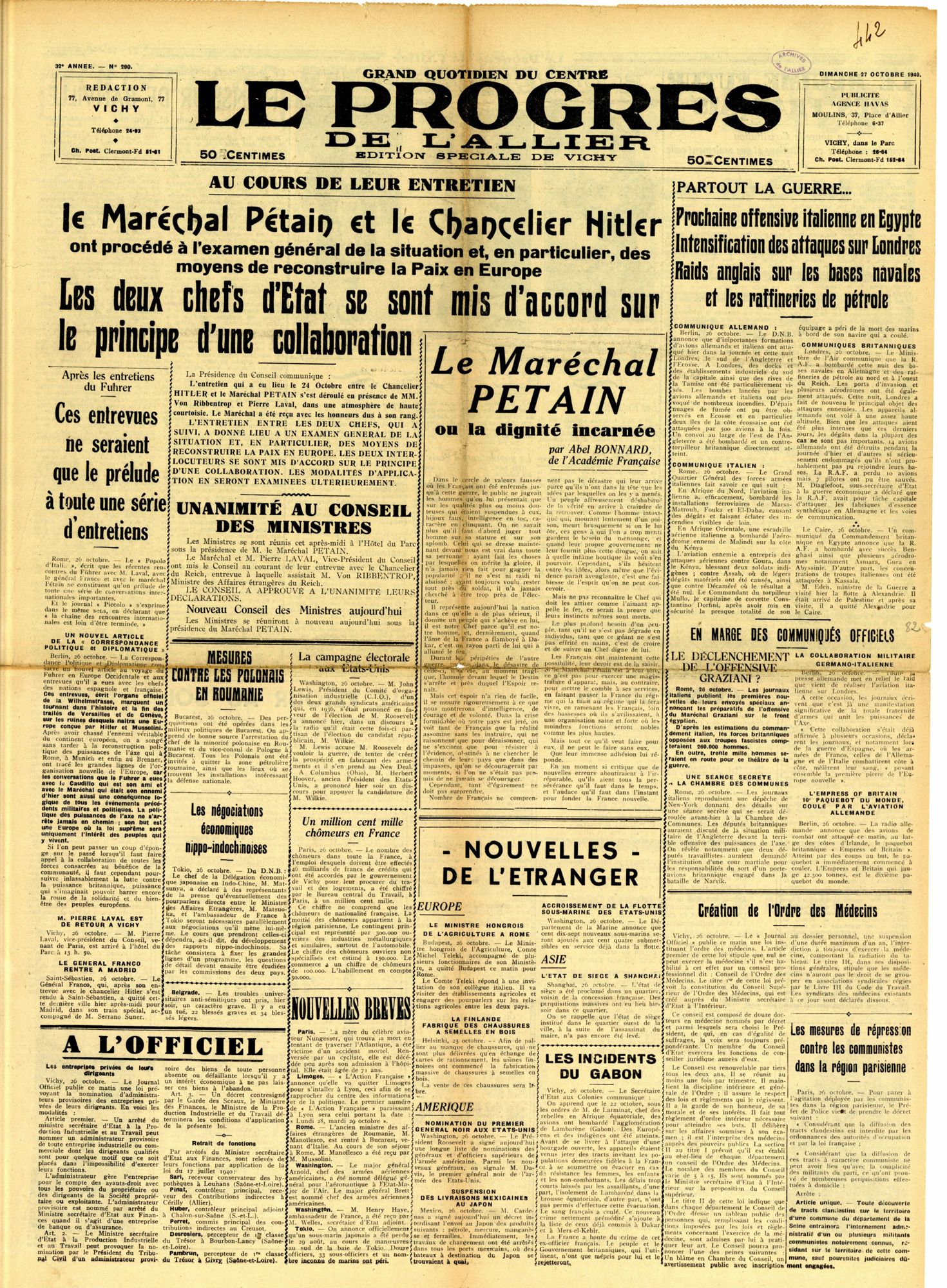 Après la défaite et l’armistice de 1940, rares sont les journaux comme Le Populaire qui choisissent de se saborder. La plupart des titres d’avant-guerres’installent en zone libre sous l’autorité de l’Etat français. Dès juillet 1940, un secrétariat général à l’information est mis en place qui organise la censure sous la forme de consignes ou de notes d’informations. Dans l’ensemble, la presse est docile et dévouée au Maréchal Pétain. Elle applique les consignes de censure et relaie la propagande officielle, même si les rappels à l’ordre sont fréquents. A partir de juillet 1940, certains journaux regagnent la capitale occupée en pariant sur une victoire allemande. Ils doivent alors se soumettre aux services de censure allemands : la Propaganda Abteilung. L’occupant favorise la réapparition de titres anciens comme Le Matin ou Le Petit Parisien et la création de journaux collaborationnistes virulents qui cherchent à faire basculer l’opinion du côté des nazis.