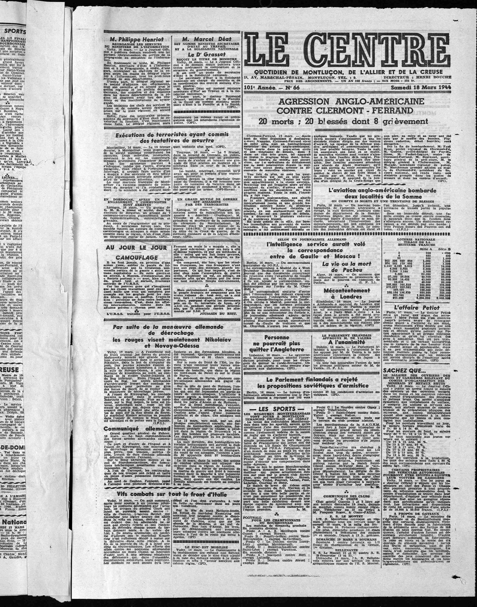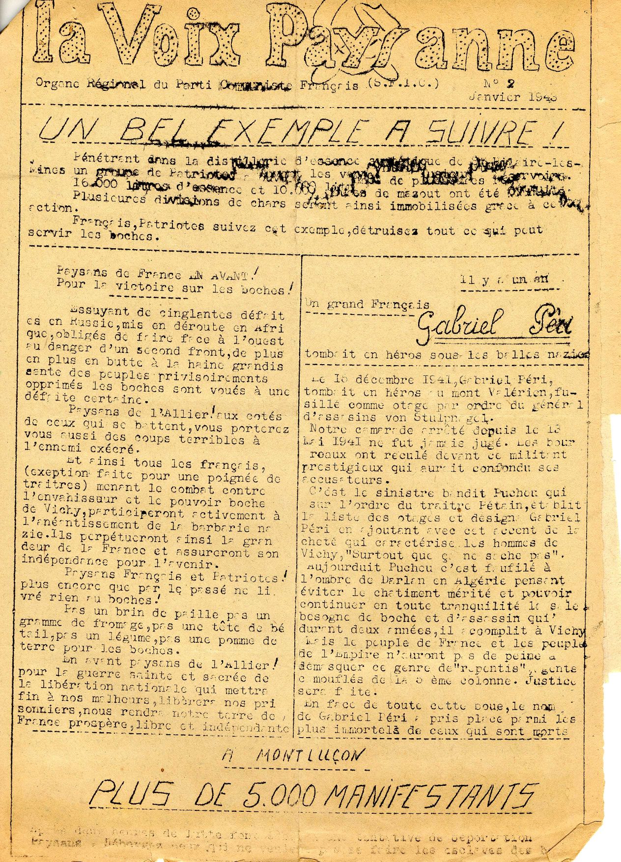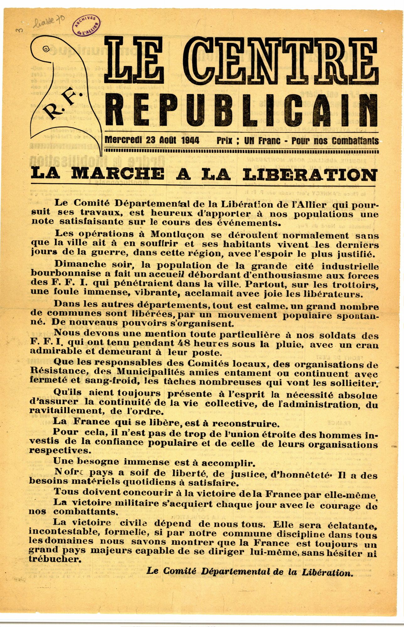 A la Libération, la presse connait une vague d’épuration et une restructuration. Selon l’ordonnance du 30 septembre 1944, les journaux ayant paru après le 25 juin 1940 (date d’entrée en application de l’armistice) doivent disparaitre, ce qui représente la quasi-totalité de la presse française. Quelques rares journaux qui ont paru jusqu’en 1943 comme La Montagne restent autorisés en raison des services rendus à la Résistance. Dans l’Allier, Le Progrès de l’Allier change de nom et devient Valmy à partir du 11 septembre 1944, tandis que Le Centre devient Le Centre Républicain à partir du 21 aout 1944. Des journaux autrefois clandestins comme Combat ou des titres interdits depuis 1939 comme L’Humanité paraissent désormais librement.